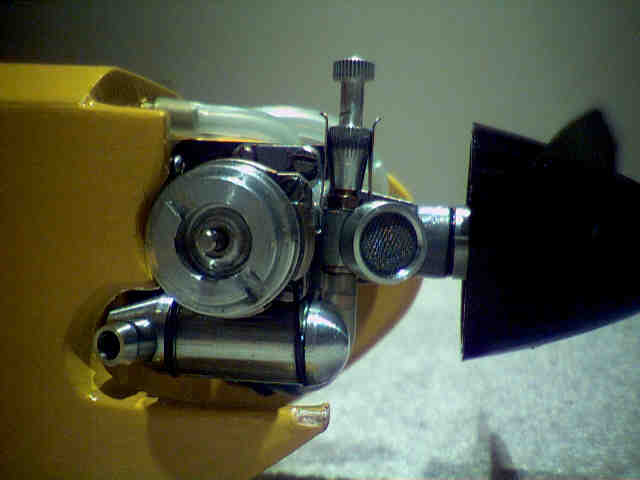 Engine BehaviourOpinions vary on getting the engines running. My new engine seemed really tight at top-dead-center, which I presume was causing overheating during running in, as the piston/sleeve rub to a good fit. The engine was certainly reticent to keep running, and would not run for a full tank even on what appeared to be a stable needle valve setting. The changeover from a primed engine to one happily running on the needle valve setting was tough. I found dabbing a finger over the air intake to keep fuel flowing while the engine was warming up was a good method to getting the thing to keep running while fiddling with a the needle to figure out where it would run on its own. Once run in, and installed in the plane, the crankcase pressure feed and the right needle setting should just keep the engine screaming until the fuel runs out. Getting the thing running stably is a knack you have to build. The best starting method seems to be to use a starter to turn the motor without priming it. This develops enough pressure to get the pressure feed in the tank going, and once the engine fires, it should keep going. The racing trick is to fill the tank ahead of time, which often spurts fuel back into the crankcase via the pressure feed hose. Turn the prop with the starter (no power to the plug) to get the excess fuel out, then fire up the plug. Start the engine. This will prevent the engine locking, and burn out what excess fuel remains. When the engine is running well, pinch the feed tube to stop the engine. I was always first to be ready to launch using this method. |